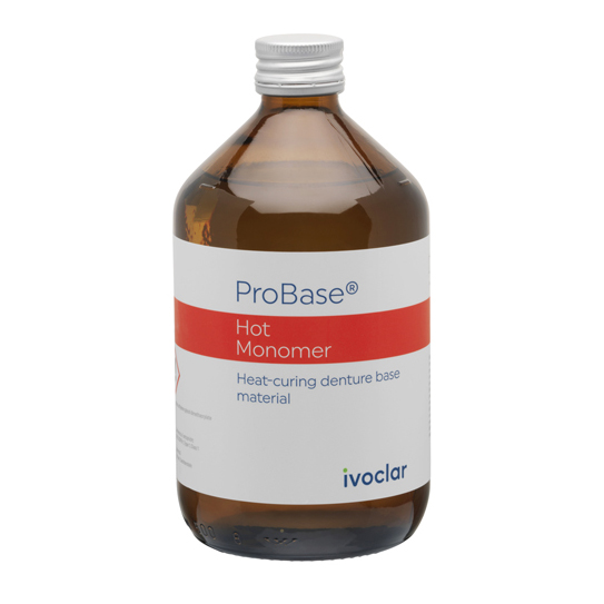 Resina per protesi, monomero Polimerizzante a caldo a base di PMMA per protesi parziale e combinata, protesi ibrida nonché ribasature e ricostruzioni su impianti. Alta qualità di lavorazione, precisione, stabilità di forma e colore. Conformità ISO EN 20795-1. Dispositivi medici di classe IIa. <b>Vantaggi:</b> • Utilizzabile con diversi metodi di polimerizzazione della tecnica di zeppatura; • Buona lavorazione; • Dosaggio libero; • Stabilità di forma e colore. Confezione: flacone da 500 ml.