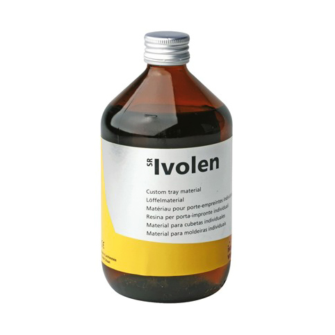 Materiale per portaimpronte individuali – ricambio liquido 500 ml. Ivoclar SR Ivolen autopolimerizzante: Il materiale per portaimpronte stabile nella forma, non appiccicoso e poliedrico si distingue per la sua ottimale fase di indurimento. È impiegabile con tutti i materiali per impronta con utilizzo dell'adesivo. <b>Vantaggi:</b> • Elevata precisione • Adattabile in modo preciso <b>Indicazioni:</b> • Portaimpronte individuali • Placche base • Placche di registrazioni intraorali Confezione: flacone da 500 ml.