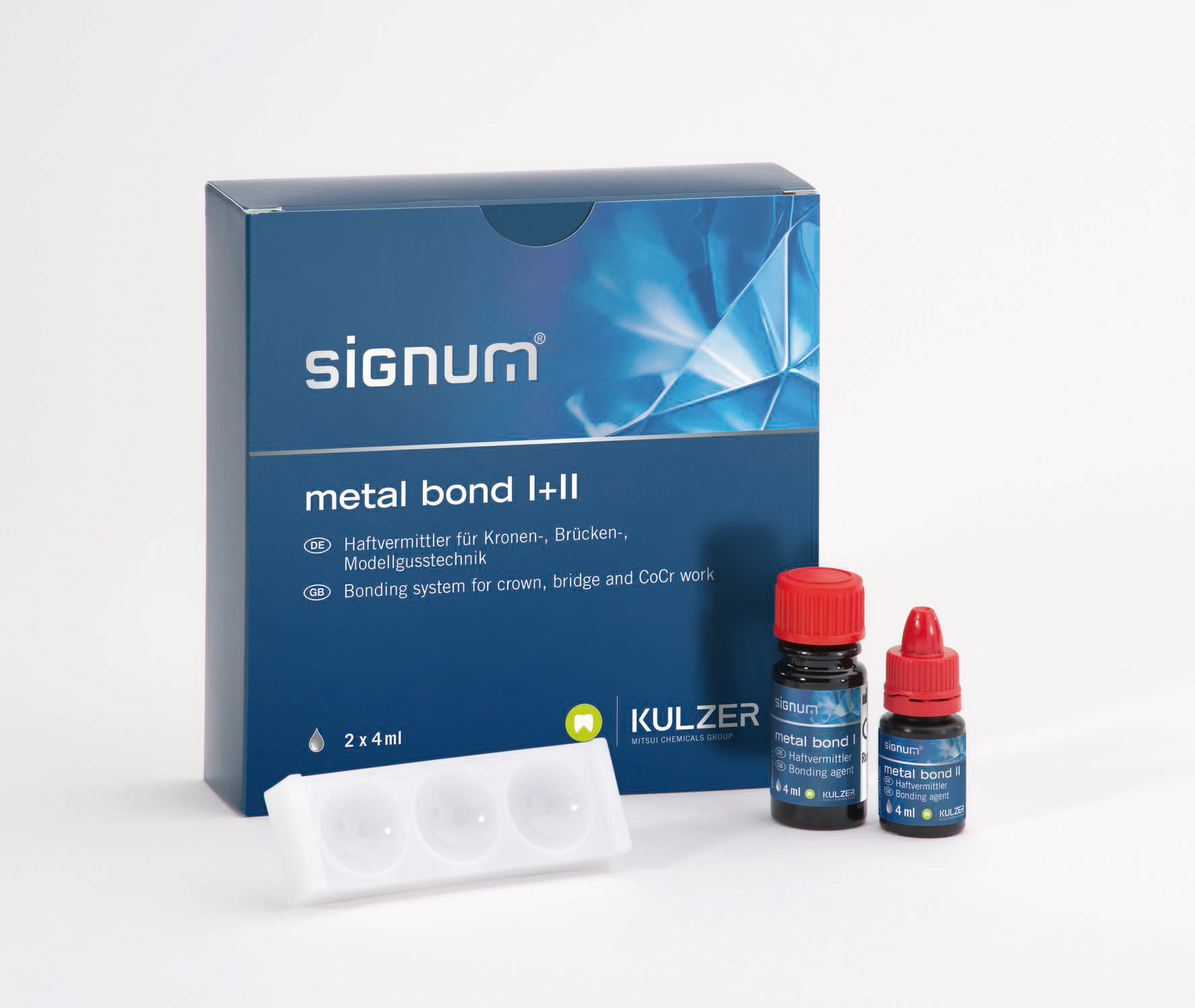 Sistema adesivo a freddo – 2 flaconi di Signum metal Bond I e II (4 + 4 ml.) 66033913 KulzerSignum Metal bond č un sistema adesivo a freddo, dove molecole bifunzionali producono un'adesione chimica tra la struttura in metallo e gli strati polimerizzati (opaco, composito). Con una lavorazione semplificata e pių rapida rispetto ai processi di adesione a caldo o alle tecniche di sabbiatura, Signum Metalbond garantisce una forza di adesione sopra la media.