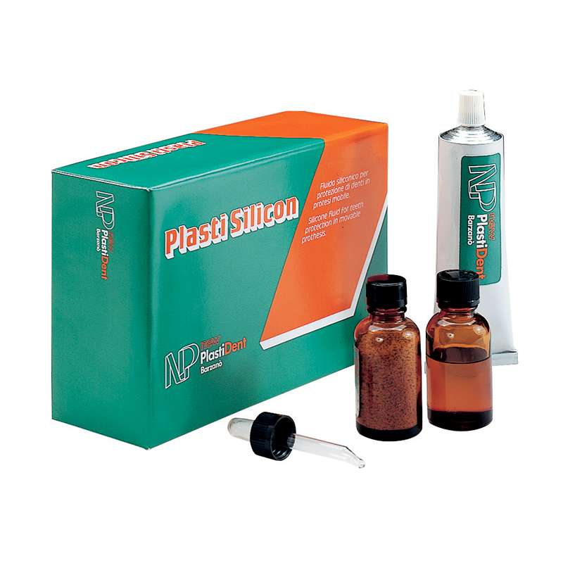 Fluido siliconico per protezione di denti in protesi mobile. Silicone isolante per la protezione dei denti dal gesso, completo di: 1 silicone da gr.160, 1 cataliz. liquido, 1 granuli ritentivi da cc. 80, 1 blocco impasto