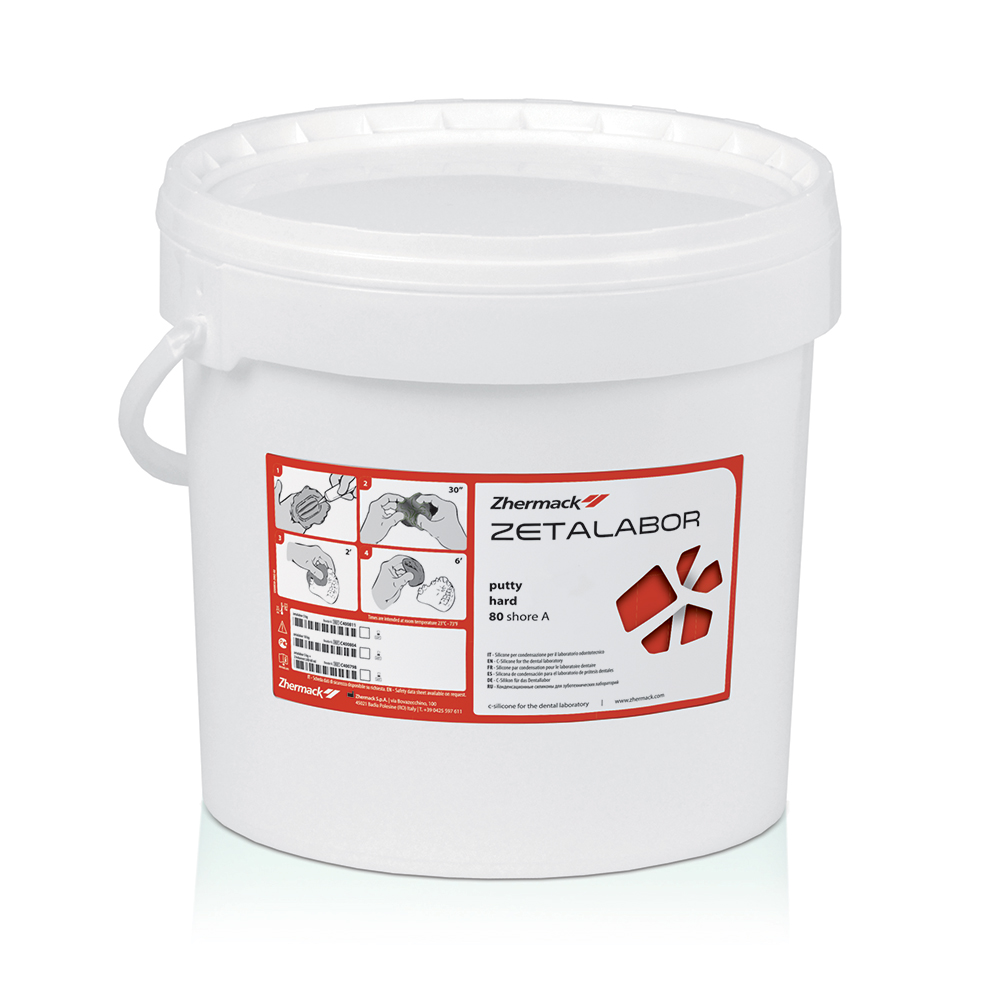 Silicone–C per condensazione specifico per mascherine, 85 Shore A – barattolo base da 10 kg. (no catalizzatore) C400804 Zhermack Silicone–C specifico per mascherine: di controllo per la progettazione della struttura metallica; per la zeppatura della resina in protesi combinata; per l'esecuzione di manufatti protesici provvisori e per riprodurre maschere gengivali removibili (Gingifast Zhermack). Indicato anche per l'isolamento denti/gesso in muffola <b>Vantaggi:</b> • Altissima scorrevolezza iniziale • Buona durezza finale • Elevata riproduzione dei dettagli • Nessuna deformazione in muffola e resistenza alla rottura • Resistenza al calore 110°C • Elevata consistenza plastica <b>Caratteristiche:</b> • Silicone miscelabile con il catalizzatore in gel • Durezza finale 85 Shore A • Non pigmentato