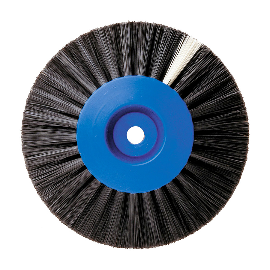 Spazzole per pulitrice con centro in plastica, in setola di Chungking nera extra dura, Ų 80 mm. 4 strati per 20 mm convergenti – confezione da 12 pz. 1480 Hatho Le spazzole HATHO per pulitrice, con nottolino centrale in legno inserito nella plastica (HoPla) vengono prodotte con setole Chungking di prima qualitą e con altri tipi di setole sempre sceltissimi. Il nottolino di legno, inglobato nel centro di plastica, consente di fissare e togliere facilmente le spazzole HoPla dal mandrino conico della pulitrice. Queste spazzole sono prodotte con folti mazzetti di setole, ben ancorati al centro in plastica, e questo contribuisce considerevolmente all'alto standard qualitativo delle spazzole HoPla HATHO. Le spazzole per pulitrice con setole pił lunghe e quindi pił morbide, si utilizzano per la prelucidatura di resine per protesi, compositi e leghe di metalli nobili. Le spazzole per pulitrice con setole pił corte, e quindi pił dure, sono utilizzate in modo particolare per metalli non preziosi e cromo cobalto. Spazzole HoPla 1480 • Materiale: setola dura di Chungking nera • Spazzola Diametro Ų 80 mm