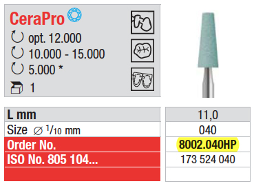Cerapro 8002 040 iso 173524, cono tronco celeste, per ceramica, misura 0,40 x 11 mm., confezione 1 pezzo, 8002–040HP Edenta