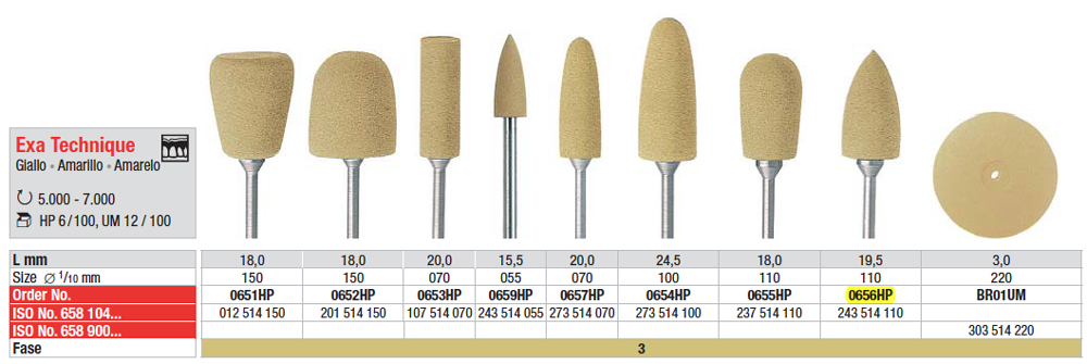 Exa Technik 656 diam.110 iso 243514 gommini gialli a punta, grana fine, per manipolo dritto, per lucidatura, confezione 6 pezzi, 0656HP Edenta