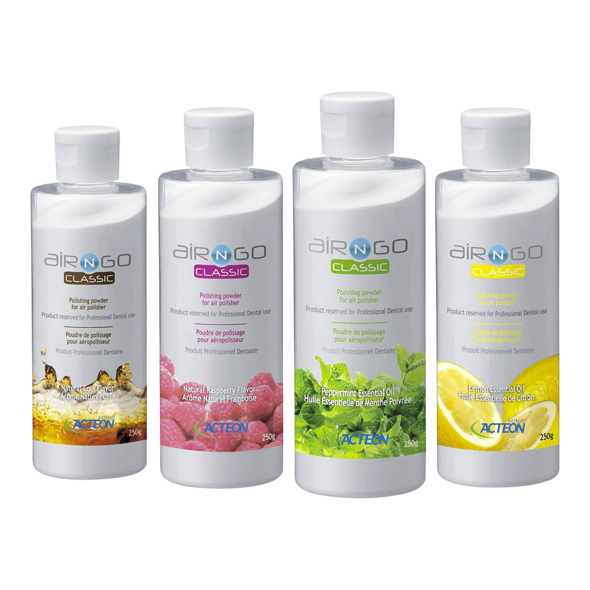 Polveri per profilassi gusti assortiti. Le polveri AIR-N-GOŽ sono state appositamente progettate e studiate per garantire un trattamento efficace e delicato su tutte le superfici trattate. A base di bicarbonato di sodio (≈76 μm). Gusti freschi a base di aromi naturali al 100% o oli essenziali: cola, lampone, menta piperita e limone. Rimozione di macchie colorate e placca batterica, anche in aree difficilmente accessibili. Maggiore comfort del paziente: delicato ed efficace con sanguinamento limitato durante il trattamento.
