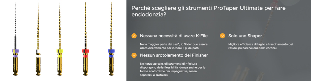 <b>Una singola sequenza Slider-Shaper-Finisher in grado di coprire lo spettro completo di morfologie canalari</b> ProTaper Ultimate č un ulteriore perfezionamento di ProTaper Universal e ProTaper Gold. Mantenendo la stessa filosofia e una tecnica simile rispetto alle precedenti generazioni di ProTaper, vi aggiunge grandi vantaggi operativi come una maggiore flessibilitā, una maggiore resistenza alla fatica ciclica e una migliore semplicitā di lavoro. ProTaper Ultimate č una soluzione endodontica completa che unisce l'ultima generazione di strumenti ProTaper a una migliore disinfezione e ad un concetto di otturazione dedicato, per un flusso di lavoro integrato e continuo.