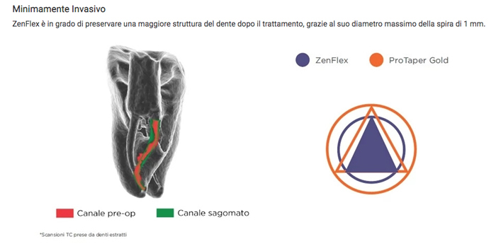 <b>Strumento Rotante in lega NiTi per Sagomatura</b> Caratteristiche principali: • Elevata efficienza di taglio — Progettato con sezione trasversale triangolare con trattamento termico brevettato, ZenFlex presenta un'elevata efficienza di taglio che consente di raggiungere l'intera lunghezza di lavoro anche in presenza di geometrie radicolari complesse. • Minimamente invasivo — Un diametro massimo della spira di 1 mm e una punta non tagliente lavorano insieme per ridurre al minimo il trasporto e preservare l'integritą strutturale del dente. • Forza Eccezionale — Resiste allo stress torsionale e alla fatica ciclica offrendo, di conseguenza, un rischio minimo di rottura e un ridotto trasporto. • Eccellente Flessibilitą — Il trattamento termico brevettato offre un'eccellente memoria controllata e un' eccellente flessibilitą per curvature fino a 90˚.