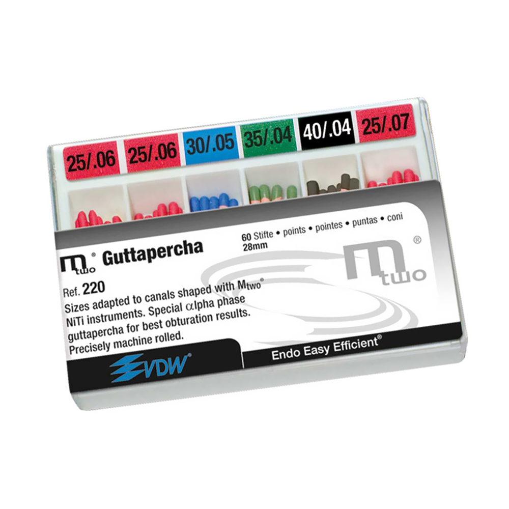 Guttaperca MTwo iso 40 conicita' 04 lunghezza 28 mm confezione 60 pezzi VDWPunte coni di guttapercha standardizzati ISO. Lunghezza 28 mm.