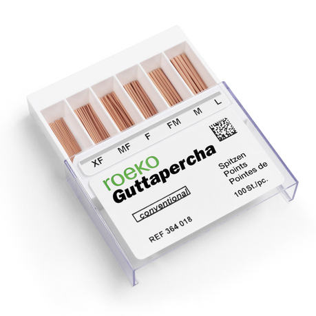 Guttaperca rosa misura M, lunghezza 28 mm, confezione 100 pezzi, codice 364015 Media RoekoPunte convenzionali di guttapercha Roeko presentano una maggiore conicità e si utilizzano anche aggiuntive nella tecnica di condensazione