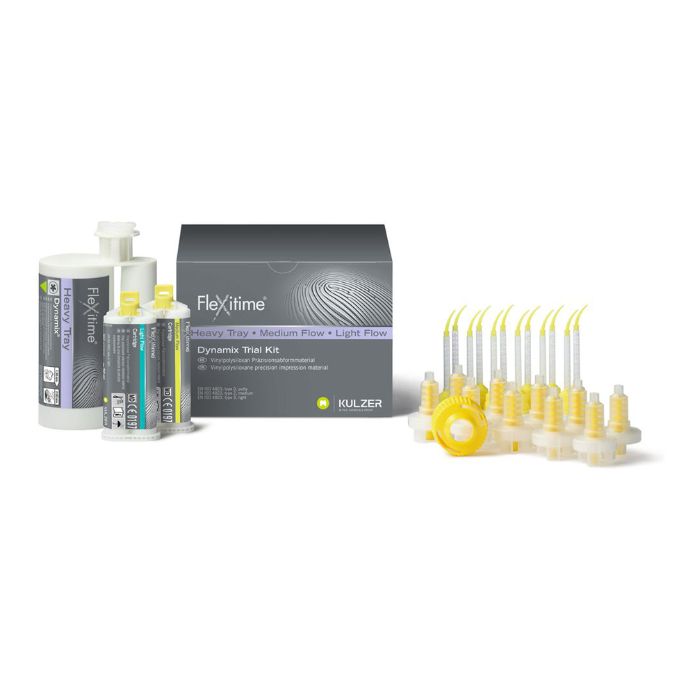 Materiale da impronta – Trial Kit: 1 cartuccia da 380 ml. + accessori 66041071 Kulzer Flexitime DYNAMIX Heavy Tray Trial Kit: • 1x 380ml Dynamix Heavy Tray, • 1x 50ml Light Flow, • 1x 50ml Medium Flow, • 10 Puntali miscelazione, • 1 anello fissaggio Dynamix, • 12 Puntali miscelazione gialli, • 12 Intraoral Tips gialli Flexitime è il materiale per impronta VPS di Kulzer, il cui sviluppo si è basato tenendo conto di questi fattori di successo. Grazie al bilanciamento delle proprietà fisiche clinicamente rilevanti, Flexitime permette di prendere sempre impronte accurate.