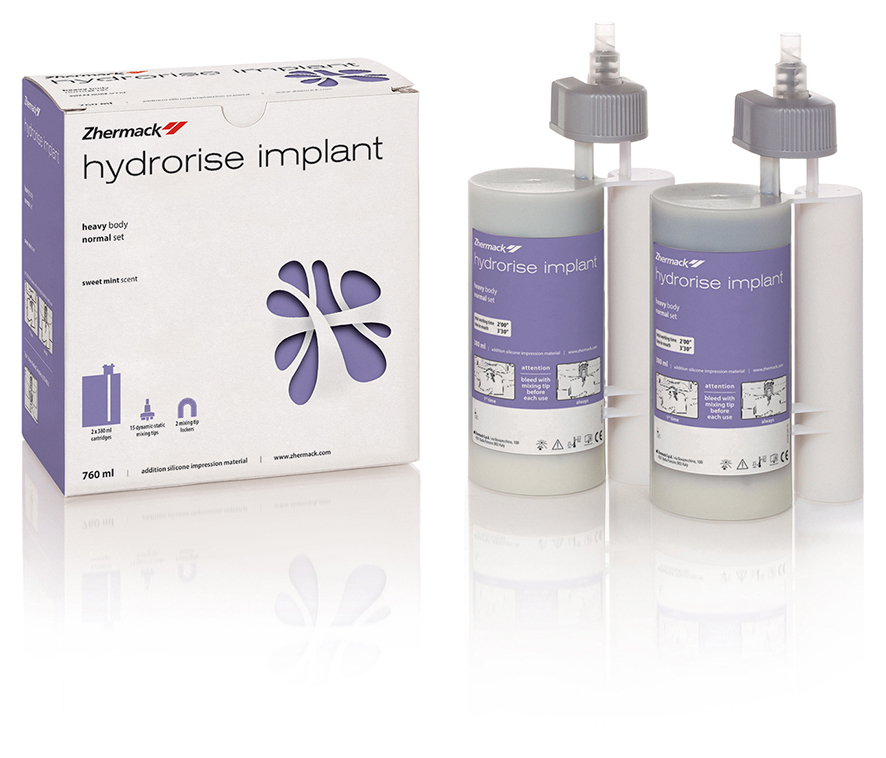 HYDRORISE IMPLANT HEAVY BODY 2 x 380 ml – codice C207090 ZhermackNuova gamma di materiale da impronta a base di siliconi A iperidrofili adatta per qualsiasi tecnica di impronta e per tutte le situazioni cliniche.