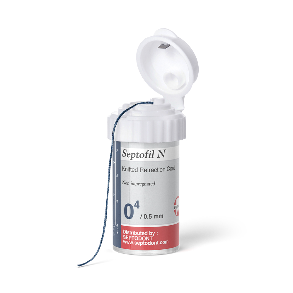 Filo retrattore non impregnato. Fili non impregnati, in cotone 100% intrecciato, di forma cilindrica, che permettono un agevole posizionamento nel solco gengivale. Septofil N è disponibile in 6 diametri identificabili da diversi colori.