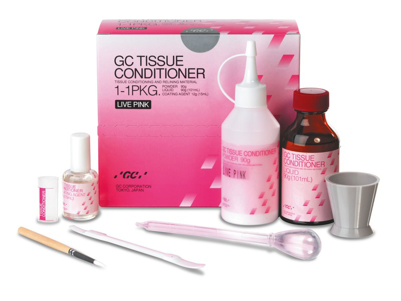 GC tissue conditioner resina ribasante soffice di colore rosa fibrillato – confezione kit 90 g + 101 ml + accessori – codice 002894 GC