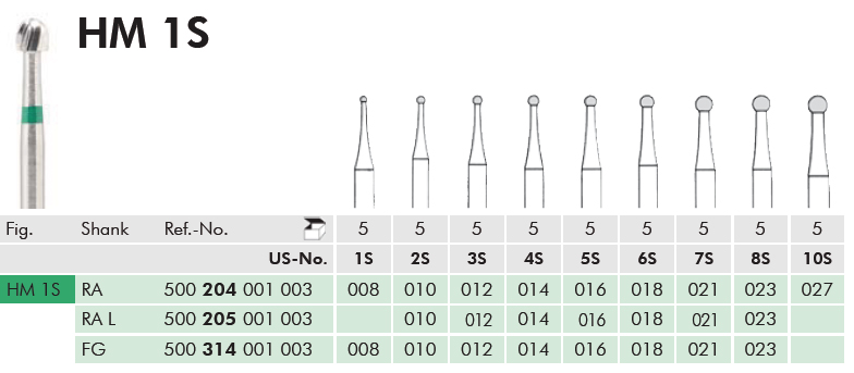Frese tungsteno per contrangolo CAL–205 figura HM1S 014 (ISO 001003) confezione da anello verde 5 pz. Meisinger
