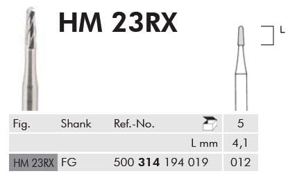 Frese tungsteno per turbina FG–314 figura HM23RX 012 Magician (ISO 194019) tagliacorone – confezione da 5 pz. MeisingerAttacco: FG (314) per turbina standard