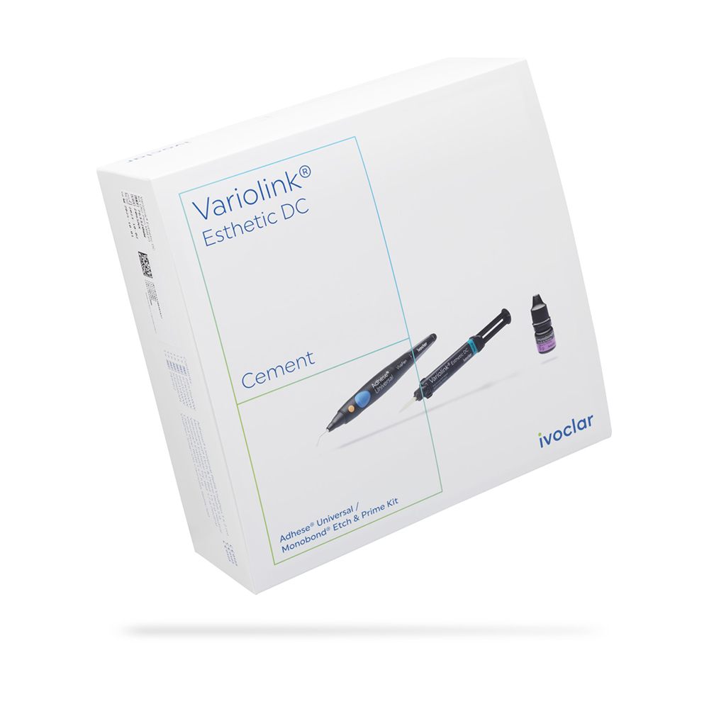 Cemento composito fotopolimerizzabile per restauri. 763320WW Ivoclar Vivadent DC Kits assortimento con Adhese Universal VivaPen + Monobond Etch & Prime Il Kit contiene: • 1x Variolink Esthetic DC Neutral 2g • 1x Variolink Esthetic Try-In Paste Neutral 1.7g • 1x Adhese Universal VivaPen 2ml • 1x Monobond Etch & Prime 5g • 1x Liquid Strip 2.5g