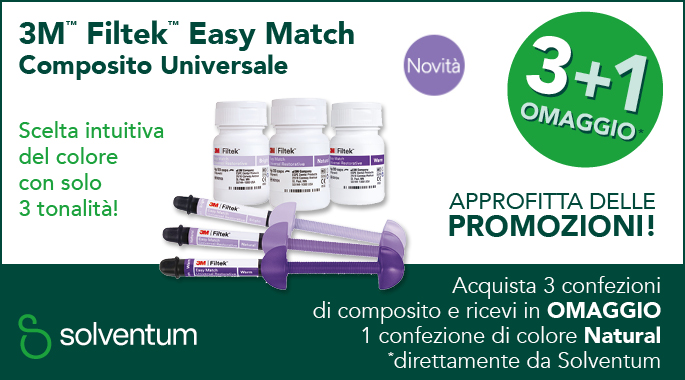 Selezione semplificata del colore per restauri single-shade anteriori e posteriori. Solo tre tonalità (Bright, Natural e Warm) che coprono i colori della scala VITA classical. L'opacità si adatta naturalmente al colore del dente mostrando una traslucenza simile allo smalto, dove serve: sul bisello e sul bordo incisale. Eccellente mantenimento della lucidatura e corrispondenza cromatica Eccellente forza e resistenza all'usura Ottima lavorabilità e mantenimento della forma Con la stessa VERA nanotecnologia che sta alla base dei principali compositi dentali 3M™ Filtek™ Grazie alla capacità dell'opacità che si adatta naturalmente al colore del dente e ad oltre 50 anni di scienza ed innovazione nel campo dei compositi dentali, il composito 3M™ Filtek™ Easy Match Universal offre un sistema semplice ed intuitivo di selezione del colore per semplificare le procedure di restauro diretto senza compromettere l'opacità. Questo sistema a 3 colori è stato progettato per fornire un'eccellente match cromatico nella maggior parte dei casi clinici, in modo semplice e intuitivo. Confezione: siringa da 4 g.