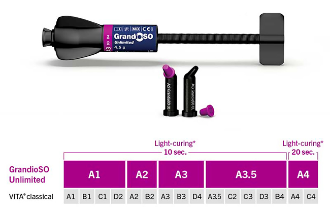 <b>Composito universale compattabile fino a 4 mm di spessore in cinque cluster-shades</b> Mentre i compositi estetici universali devono essere stratificati in modo elaborato e polimerizzati con incrementi di 2 mm, i compositi bulk-fill presentano il vantaggio di poter applicare incrementi fino a 4 mm nella cavità. Tuttavia, i compositi bulk-fill sono utilizzati quasi esclusivamente per l’area dentale posteriore a causa della loro estetica spesso inadeguata. VOCO ha superato questa limitazione con il nuovo composito universale GrandioSO Unlimited. Il materiale estetico può essere applicato in incrementi di 4 mm nella cavità ed è indicato sia per l’area dentale anteriore sia per quella posteriore. D’ora in avanti, quindi, gli studi dentistici possono beneficiare di un unico composito universale compattabile per svolgere il loro lavoro quotidiano! Grazie al sistema di colori semplificato, tutte le 16 tonalità VITA® classical possono essere coperte con solo cinque Cluster-Shade. Ciò consente di soddisfare sempre in modo ottimale qualunque esigenza con soli cinque colori, riducendo significativamente anche lo spazio occupato in magazzino. <b>Indicazioni:</b> • Restauri di cavità di classe da I a V • Ricostruzione di anteriori danneggiati da trauma • Faccette di anteriori con discromia • Correzione di forma e colore per un aspetto estetico migliorato • Immobilizzazione, splintaggio di denti anteriori • Riparazione di faccette • Restauro di denti decidui • Build-up di moncone sotto corone • Inlay in composito <b>Vantaggi:</b> • Universale: per elevate esigenze estetiche nell‘area dentale anteriore e posteriore • Nessuna stratificazione: incrementi fino a 4 mm di spessore • Eccellente manipolazione: ottime proprietà di modellazione e lucidatura • Composito ad alte prestazioni: 91% di contenuto di riempitivo per la massima stabilità e resistenza • Sistema di colori semplificato: le 5 Cluster-Shade consentono di coprire tutti i 16 colori VITA® classical • Efficiente: significativo risparmio di spazio in magazzino Confezione Trial Pack (test Kit) cod. 6257 Voco: • n. 10 Caps x 0,3 g. Cad (2 per ciascuno di A1, A2, A3, A3.5, A4), • n. 10 × Futurabond U SingleDose, • Scheda cromatica • Accessori