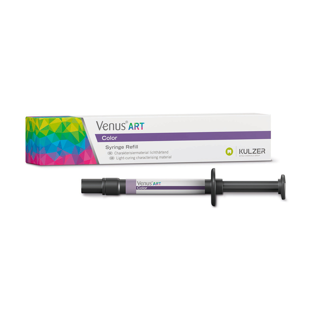 Venus Color è un composito flowable indispensabile per caratterizzare un restauro, attraverso la riproduzione di piccole incrinature dello smalto, alterazioni cromatiche di fessure o macchie bianche. <b>Indicazioni:</b> • Può essere usato puro o diluito in composito liquido trasparente per ridurre l'intensità del colore. • Si applica con un pennello oppure con uno strumento. • Fotopolimerizzabile con lampade convenzionali. <b>Caratteristiche:</b> • Compatibile con compositi dentali. • Tempo di indurimento da 20 a 40 sec. • Facile e preciso da dosare.