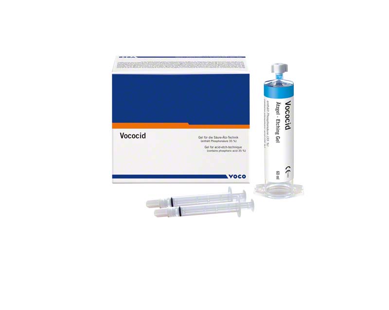 Vococid in siringa da 60 ml + siringa vuota 2 × 2 ml, accessori – codice 1257 VocoMordenzante per la tecnica etch–bond Gel mordenzante per la mordenzatura dello smalto e la tecnica della mordenzatura totale, al 35 % di acido fosforico; Colore blu per un controllo visivo; non gocciolante