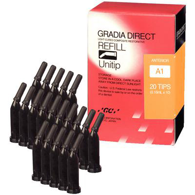 Composito fotopolimerizzabile per restauri – ricambio 20 capsule Unitip A3 Anterior Standard 1969 GCCon il nuovo Gradia Direct si possono eseguire in studio tutti i restauri fino a quelli più impegnativi dal punto di vista estetico, utilizzando un unico materiale semplice da usare. Indipendentemente dal fatto che si tratti di una procedura a colore unico o a più colori, Gradia Direct permette di ottenere, in modo più semplice e veloce, un restauro duraturo dall'aspetto naturale. Poiché il colore si adatta perfettamente alla struttura dentaria circostante, già con un unico colore si possono facilmente ottenere restauri di qualità estetica eccellente. Combinando diversi colori si apre una serie illimitata di possibilità per ottenere risultati estetici, utilizzando però al massimo tre colori per un restauro anteriore e due colori per un restauro posteriore.