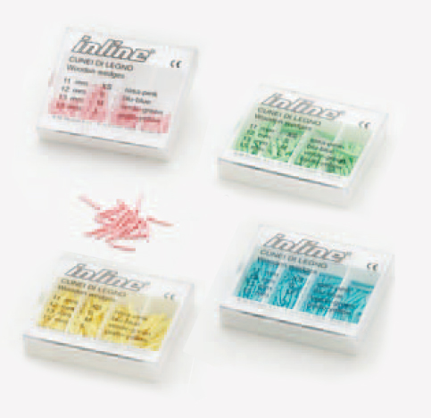 Cunei di legno disponibili nei colori : • Rosa/11mm; • Arancione/11mm; • Blu/12mm; • Verde/13mm; • Giallo/15mm; Confezione: 100pz.