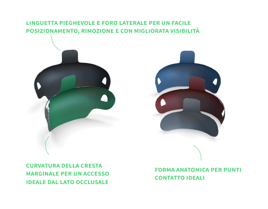 <b>Matrici sezionali in acciaio inossidabile ultrasottile con forma anatomica.</b> Le matrici sezionali Halo sono in acciaio inossidabile ultrasottile, da 0,038 mm, la loro forma anatomica assicura punti di contatto stretti a garanzia della longevitą del restauro. In particolare, la curvatura della cresta marginale consente un accesso ideale dal lato occlusale, riducendo il tempo di rifinitura. Disponibili nella versione Original per una migliore adattabilitą e brunitura, nella versione Firm, resistono alla deformazione e sono adatte per spazi interprossimali ristretti e, nella versione Firm non-stick, codificate per colore. Sono dotate di linguetta pieghevole e foro laterale per un facile posizionamento e rimozione con visibilitą migliorata. <b>Caratteristiche:</b> • Forma anatomica per punti di contatto ideali • La curvatura della cresta marginale consente un accesso ideale dal lato occlusale, riducendo il tempo di rifinitura • Linguetta pieghevole e foro laterale per facile posizionamento e rimozione con visibilitą migliorata • Matrici “Original” per una migliore adattabilitą e brunitura • Matrici “Firm” resistono alla deformazione e sono adatte per spazi interprossimali ristretti • Matrici “Firm nonstick“, codificate per colore • Le matrici “Original” e “Firm” sono in acciaio inossidabile ultrasottile da 0,038 mm HALO FIRM NON-STICK MATRICI 4,5mm - confezione da 50 pz. - Cod. 5051 Ultradent