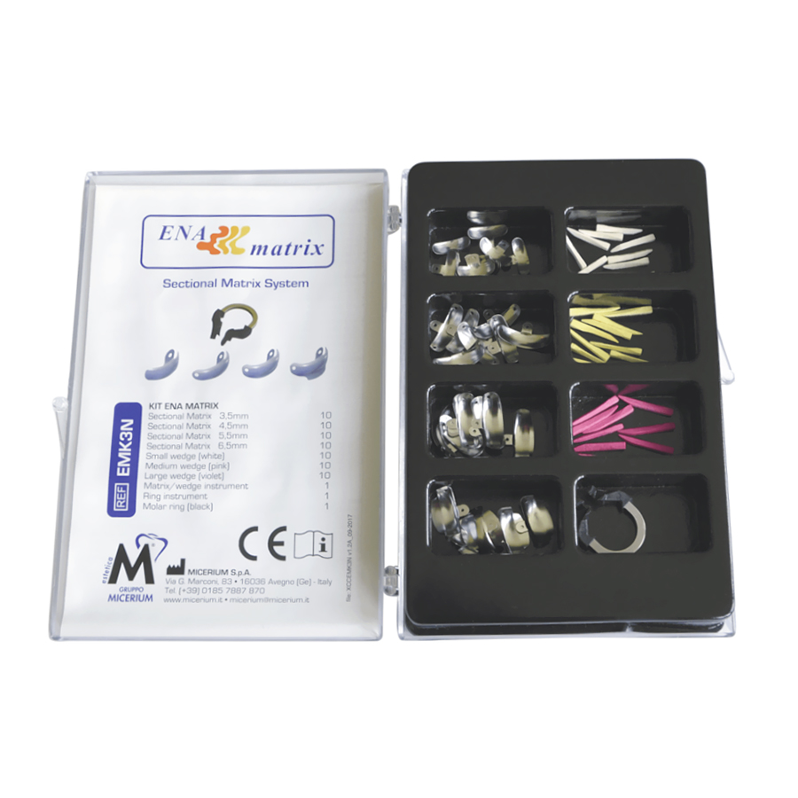 ENA MATRIX Trial Kit EMK3N Micerium Matrici anatomiche in acciaio con creste marginali e alette con foro che consentono, con l’apposita pinzetta, il posizionamento e la rimozione senza problemi. Gli anelli in nickel titanio con alette in plastica garantiscono resistenza, memoria elastica e contatti sempre precisi. <b>Il Trial Kit contiene:</b> • 10 pz Matrici con creste marginali 3,5mm • 10 pz Matrici con creste marginali 4,5mm • 10 pz Matrici con creste marginali 5,5mm • 10 pz Matrici con creste marginali 6,5mm • 10 pz Cunei di legno Small • 10 pz Cunei di legno Medium • 10 pz Cunei di legno Large • 1 pz Pinza con perno per matrici e cunei • 1 pz Pinza per applicazione anelli • 1 pz Anello per molari