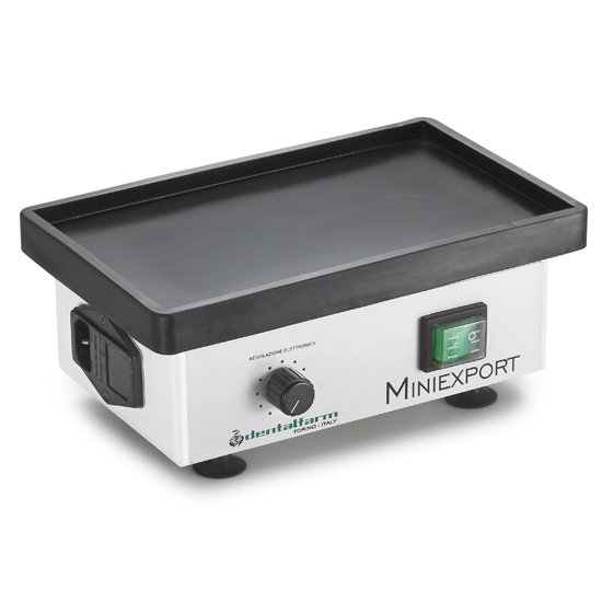 Vibratore per gessi e rivestimenti, regolazione elettronica della velocità, piatto rettangolare rimovibile – A0125 DentalfarmMINIEXPORT A0125 VIBRATORE PER GESSI E RIVESTIMENTI La vibrazione è perfettamente verticale, senza dispersioni, grazie anche all'impiego di 4 ammortizzatori e speciali piedini a ventosa che assicurano la perfetta stabilità in posizione. L'intensità e l'ampiezza del movimento del piatto sono regolate da un circuito elettronico comandato da un potenziometro. Il circuito di controllo è impregnato nella resina per garantirne l'integrità.
