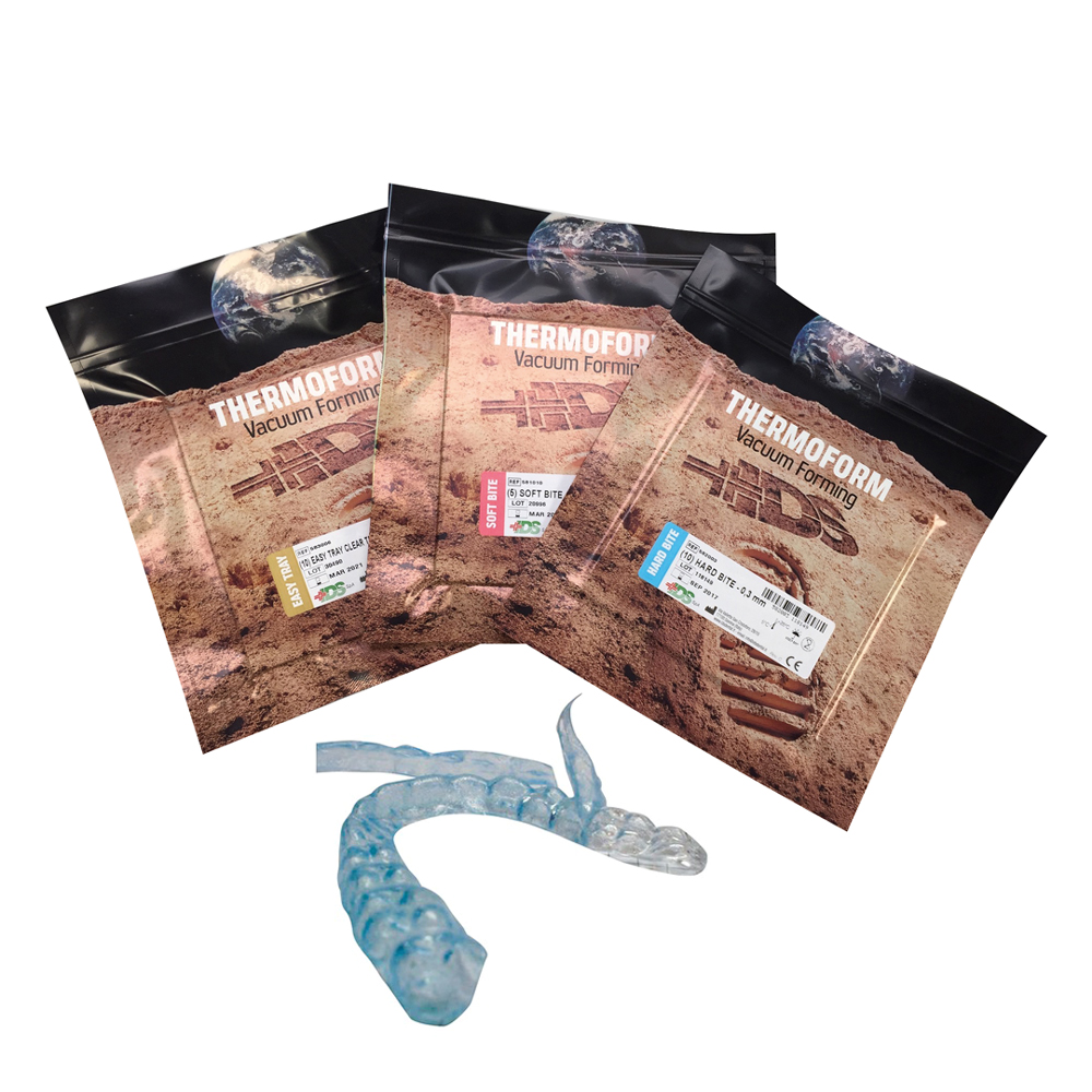 Piastre Hard Bite - Bite rigidi e trasparenti per termoformazione in PVC duro trasparente 1,5 mm. dimensioni 125 x 125 cm. – confezione Dry Pack da 10 pz. <b>Nuovo confezionamento: massima protezione dall’umidità ambientale e dal rischio di bolle</b> HARD BITE è un materiale estremamente versatile per le sue uniche caratteristiche: • Materiale duro e resiliente completamente trasparente • Pellicola protettiva/isolante su entrambi i lati. • Si lega chimicamente con le resine acriliche • Completamente calcinabile Ideale per: <b>bite occlusali duri, mascherine chirurgiche, mascherine ortodontiche.</b>